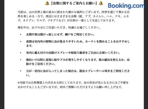 Informujte prosím Iruma INN o svém předpokládaném čase příjezdu předem. Tuto informaci můžete napsat do políčka pro zvláštní požadavky při rezervaci nebo se obraťte přímo na ubytování. Kontaktní údaje jsou uvedeny v potvrzení rezervace. Pro zaručení rezervace je třeba provést platbu předem bankovním převodem. Ubytování Vás bude kontaktovat po provedení rezervace a poskytne Vám instrukce ohledně bankovního převodu. V souladu s nařízeními úřadů usilujícími o omezení šíření koronaviru (covid-19) nepřijímá toto ubytování po dobu platnosti nařízení hosty z určitých zemí. V reakci na situaci týkající se koronaviru (covid-19) platí v tomto ubytování v současné době dodatečná bezpečnostní a hygienická opatření. Nabídka jídla a nápojů může být v tomto ubytování z důvodu situace týkající se koronaviru (covid-19) omezená nebo nedostupná. V souladu s nařízeními úřadů usilujícími o omezení šíření koronaviru (covid-19) přijímá toto ubytování po dobu platnosti nařízení rezervace pouze za účelem výkonu povolání / od osob s cestovním povolením. Při příjezdu proto musí být doložena potřebná dokumentace. Pokud tak neučiníte, bude vaše rezervace na místě zrušena. Z důvodu situace týkající se koronaviru (covid-19) platí v tomto ubytování určitá opatření pro zajištění bezpečnosti hostů a personálu. Některé služby a vybavení proto mohou být omezeny nebo nedostupné. V souladu s nařízeními úřadů usilujícími o omezení šíření koronaviru (covid-19) může toto ubytování po dobu platnosti nařízení od hosta vyžadovat předložení dalších dokumentů k ověření totožnosti, itineráře cesty a dalších relevantních informací. Z důvodu situace týkající se koronaviru (covid-19) se prosím ujistěte, že rezervujete ubytování v souladu s vládními nařízeními platnými v dané destinaci, mezi které mimo jiné může patřit zákaz cestování za některými účely a maximální povolená velikost skupiny. V tomto ubytování není možné pobývat za účelem absolvování karantény v souvislosti s koronavirem (covid-19). Hosté, kteří ještě nedovršili věku 18 let, se mohou ubytovat pouze s rodičem nebo zákonným zástupcem. Pokud během svého pobytu způsobíte v tomto ubytování škodu, může od vás ubytování po skončení pobytu na základě svých Podmínek pro případ vzniku škody požadovat náhradu až do výše JPY 15000. Provozováno soukromým hostitelem