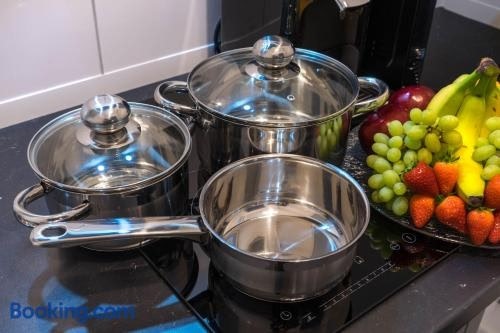 RüSuite - Messe Essen I King Size Bed I 75 Zoll TV se může pochlubit výhledem na město a nabízí ubytování s balkonem a kávovarem. Museum Folkwang se nachází přibližně 600 metrů odtud. V tomto apartmánu je dostupné bezplatné Wi-Fi.